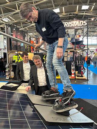 Andreas Meyer führt auf der IHM seine Erfindung den Solarschuh SOLARco.shoe vor.